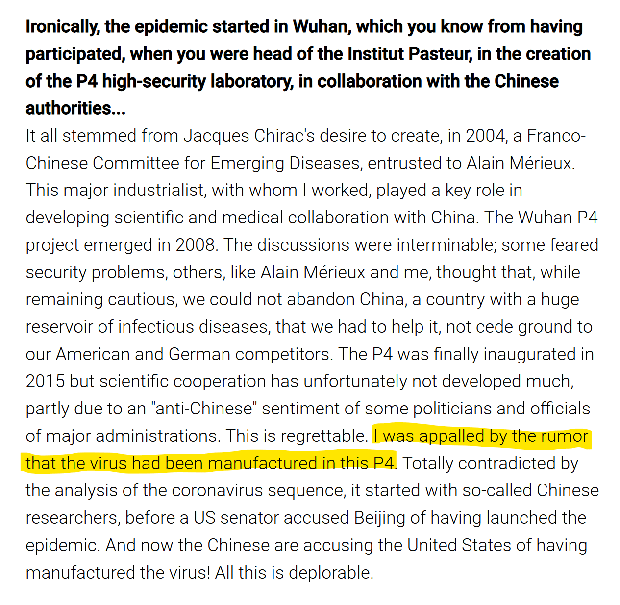 France’s China boosters were unrepentant about their involvement in the P4. Former Institut Pasteur/INSERM/Mérieux director, and WIV advisory board member, Christian Bréchot, was defiant - appalled at the "rumor the virus had been manufactured" and railing against "anti-Chinese sentiment".