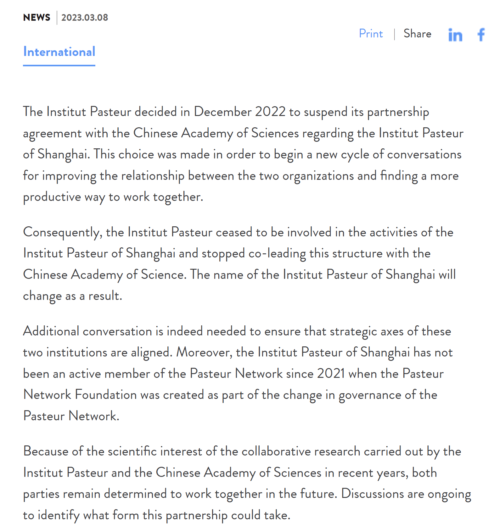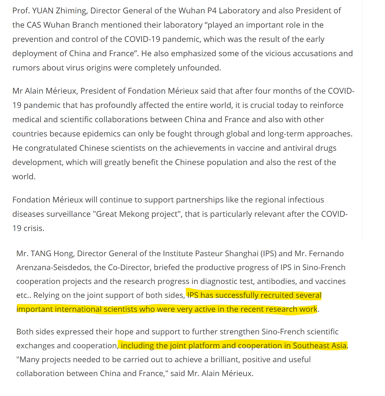 In May 2020, Alain Mérieux announced he would strengthen co-operation between his organizations and WIV/CAS. Institut Pasteur Shanghai announced they had recently recruited more scientists to expand the research collaboration between France and China.