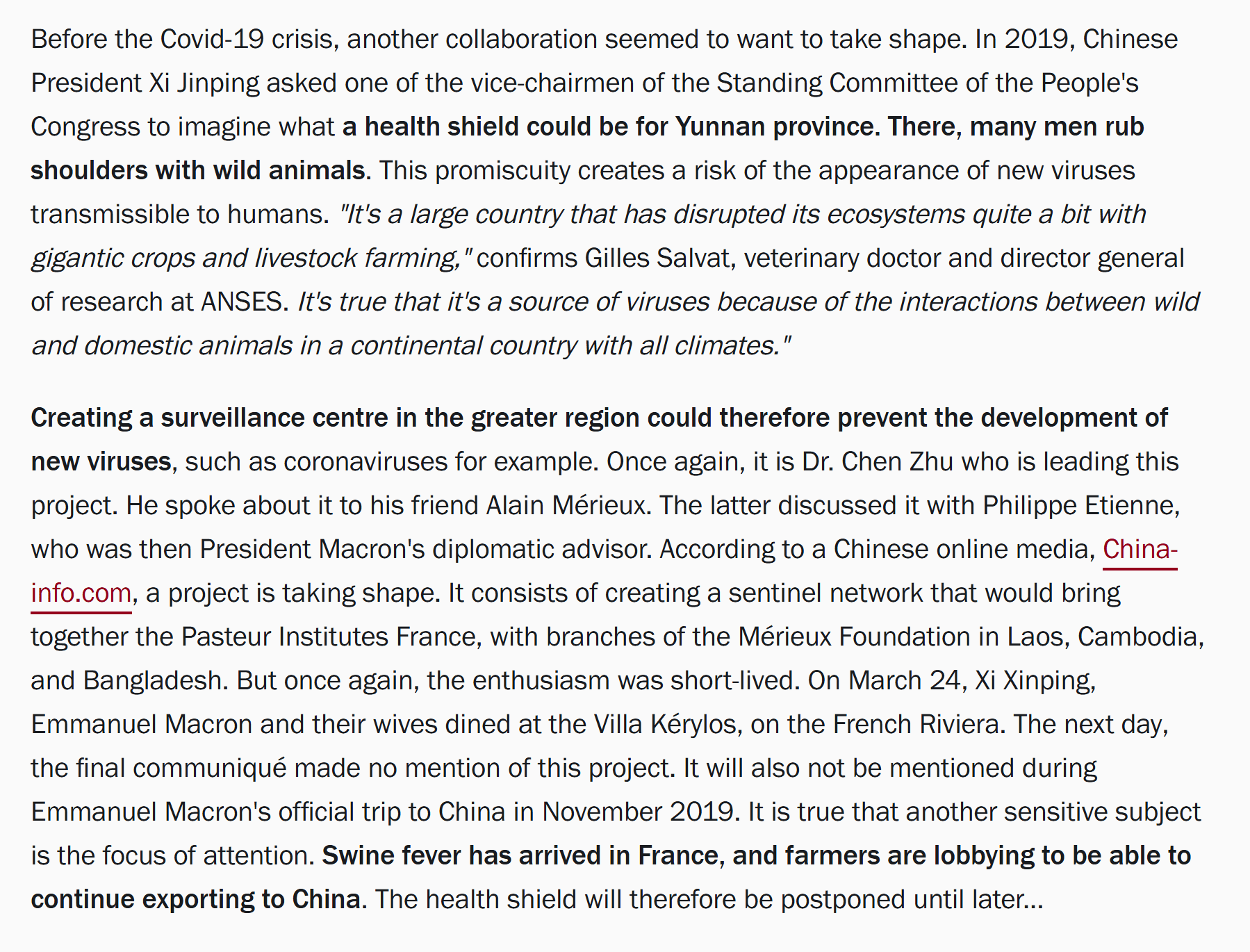 Chen and Mérieux had more recently been organizing a new collaboration on bio-surveillance at the request of Xi Jinping. This would have seen the Indochinese outposts of Institut Pasteur and Mérieux Foundation help China in the search for novel zoonotic pathogens on the other side of the Yunnan border in Laos, Cambodia and Vietnam. This would have expanded into new territory a long running project which had involved several “State Key Labs” including WIV and the PLA’s Academy of Military Medical Sciences (AMMS). But for unknown reasons this agreement wasn’t signed as anticipated.