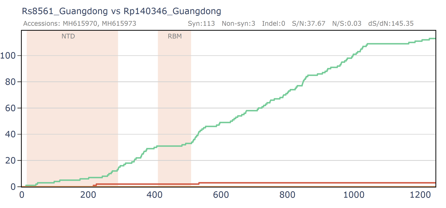 There’s another intriguing feature to this table. Another virus, Rs8561, has almost the same nucleotide identity - in each gene - to SARS, as Ra4991 does. Rs8561 was another of the sequences Cui has kept hidden on GenBank. It turns out Rs8561 is very similar to another bat virus ZC45, even though Rs8561 is from Guangdong, and ZC45 from Zhoushan, ~1500km apart. Rs8561 and ZC45, are in turn very different to Ra4991, so is it just an uncanny co-incidence?