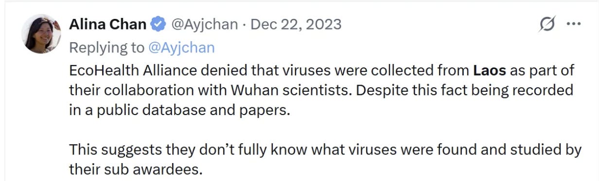 Unfortunately the Banal sequences didn’t attract the scrutiny earlier sequences did, somewhat due to Pasteur’s high reputation and the unwarranted perception of their independence from China. But also because they don’t include an FCS, they don’t entirely preclude an artificial origin, and some “lab-leakers” welcomed them as more evidence in favor of this. The suggestion was made that because the new closest virus came from Laos, not China - that pointed the finger more strongly at the US (or at least the various members of the DEFUSE consortium).