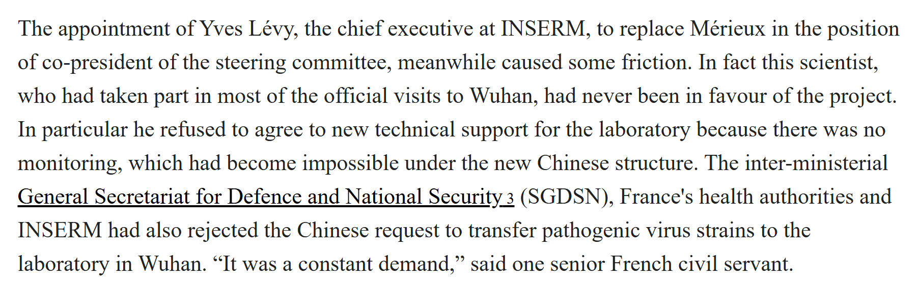 So it is important that France should participate in the investigation. But is France genuinely interested in finding out? Is there an appetite to investigate their own institutions, scientists, business leaders, politicians? French scientists I’ve been in contact with seem more interested in the US engagement with WIV, than their own. The US has taken steps to investigate itself, and these will continue. Daszak, Baric and Fauci have appeared before Congressional hearings and thousands of pages of documents have been released by FOIA. But other countries whose institutions partnered which China haven’t opened their own books. This can cause a streetlamp effect.