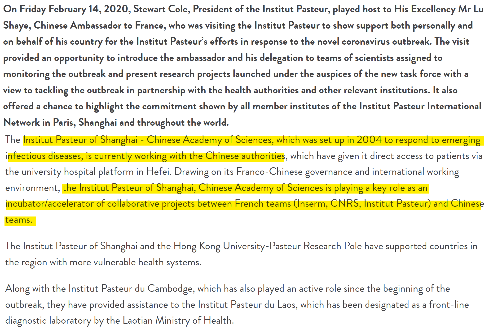 Chen is a Francophile who did his PhD and postdoc study in France. Later, as Vice President of China’s Academy of Science (CAS), he was the main driver of the project with France to design and construct the Wuhan P4 lab. Integral to this was the creation of Institut Pasteur Shanghai (IPS), a joint venture with CAS, which was intended to provide an ongoing presence of international scientists at the lab, which had been initially planned for Shanghai.