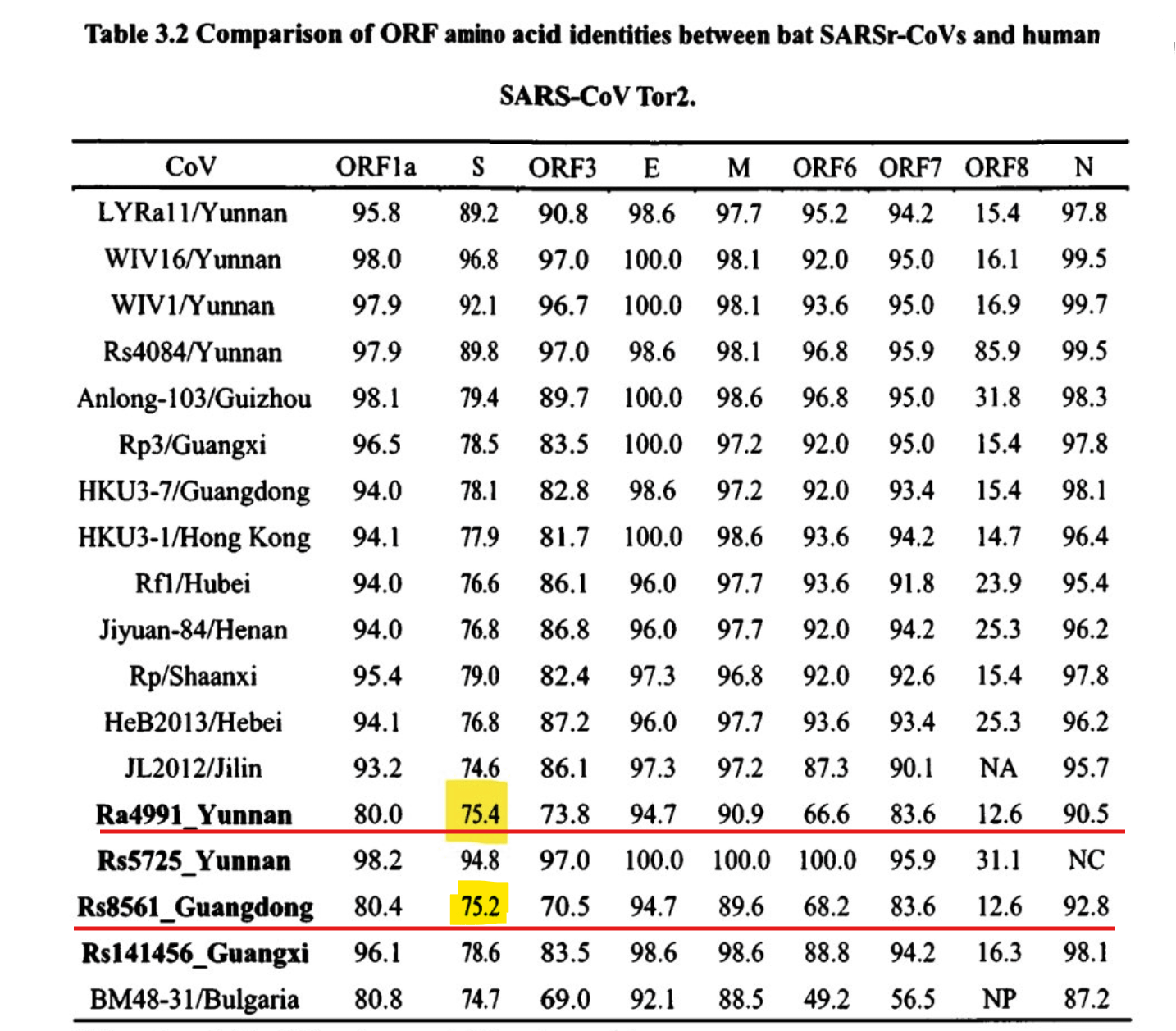 But the thesis states that Ra4991 had been fully sequenced, and it appears in a table comparing its similarity to SARS in each gene. Why was its spike sequence kept hidden?