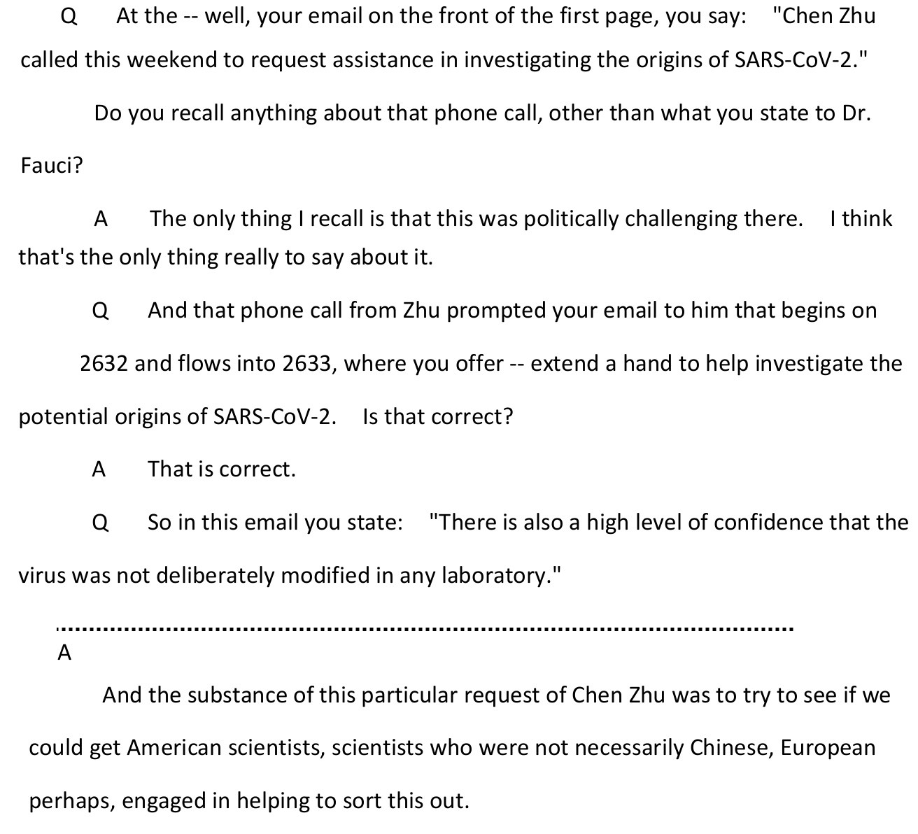 Immediately after the infamous teleconference involving Fauci, the “Proximal Origins” authors, and European scientists, Jeremy Farrar contacted a backchannel in China to discuss their concerns over an artificial origin. That was China’s former Minister of Health, Chen Zhu (at the time still Vice Chair of the National People’s Congress).