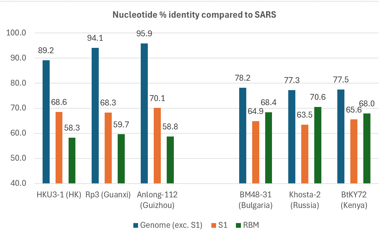 SARS genome appears to be a recombinant based around a Chinese lineage “backbone”. Chinese bat viruses have been discovered with a genome that is 90-95% identical to SARS. But the S1 domain of spike is quite divergent, identity drops to ~70%. The RBM of the Chinese lineage has large deletions such that these viruses are unable to bind ACE2 - even bat ACE2.