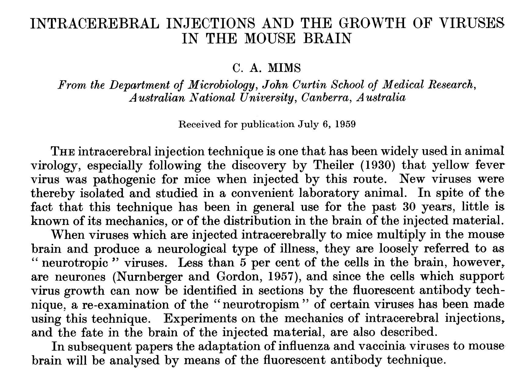 Intracerebral inoculation bypasses the blood-brain barrier which keeps most pathogens from the central nervous system (CNS). The immune response within the CNS is less robust, so that once infected, that infection may persist giving the virus time to adapt to the new host. This technique is very old, being used as far back as the 1930s to infect mice with yellow fever.