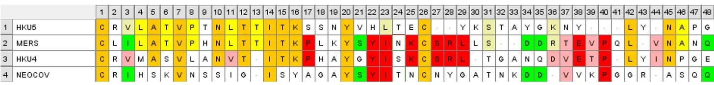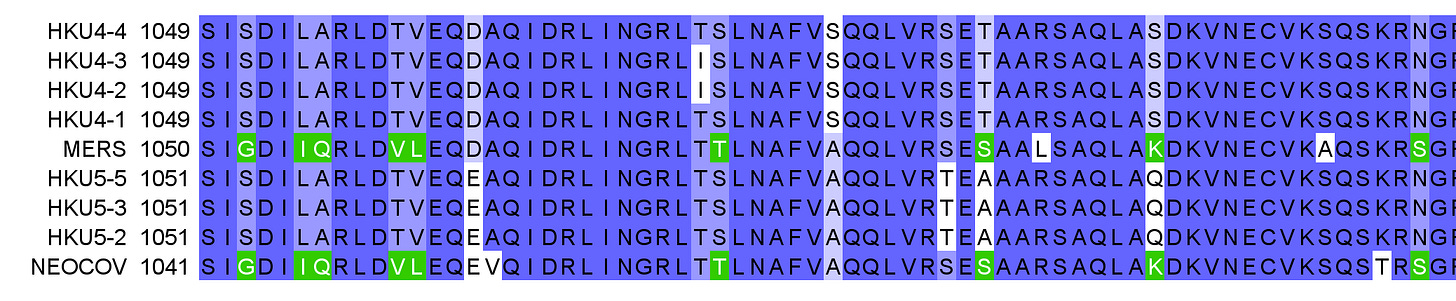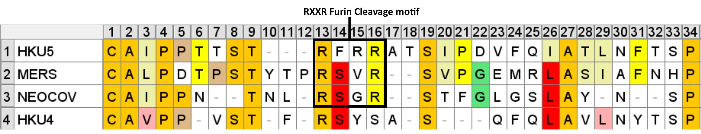 The S1|S2 junction also seems to be a bit-of a mash-up. It isn’t clear where the interesting leading Proline has come from, and there are several other residues of unexplained origin. HKU5, NeoCoV and MERS have furin cleavage motifs, HKU5 does not.