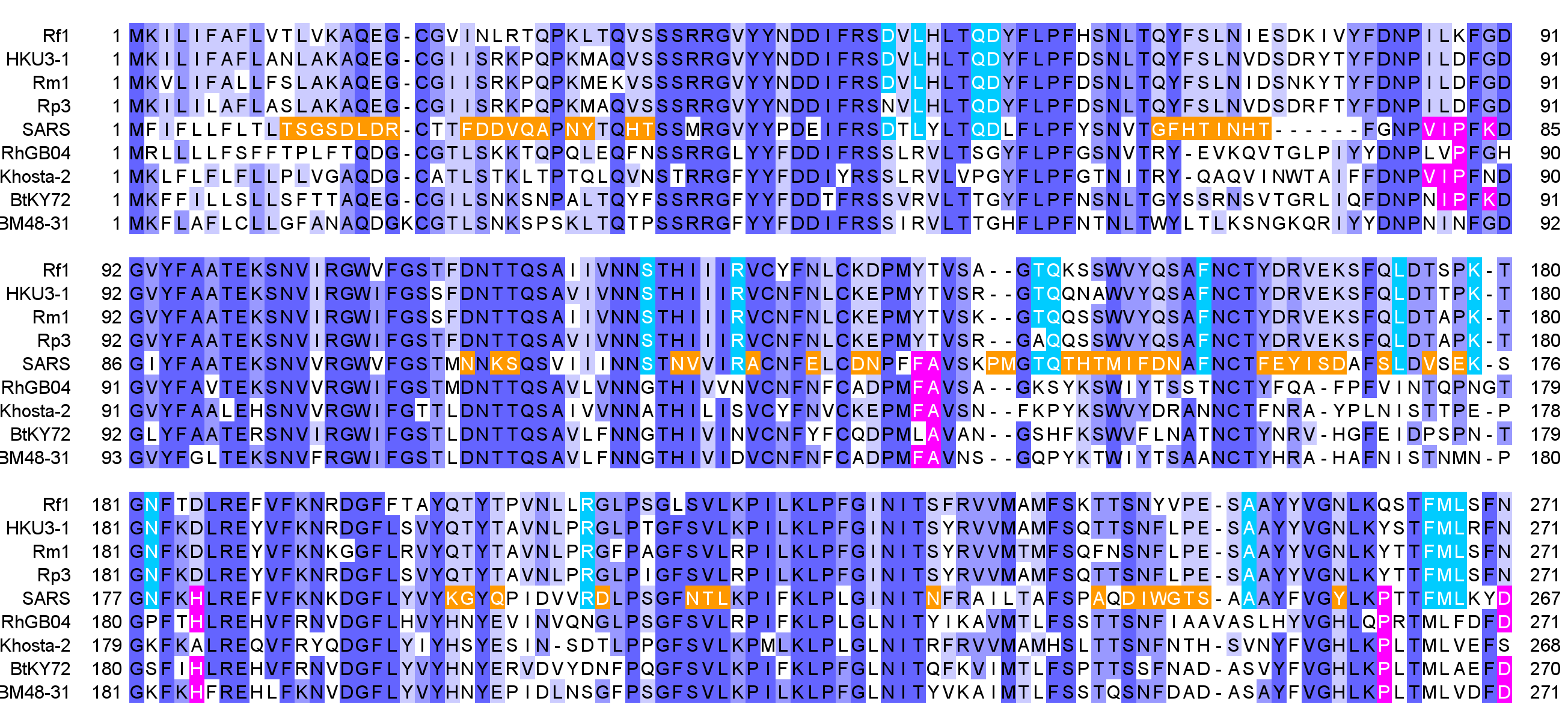 Curiously, the RBM of SARS’ spike is far more closely related to the Afro-European lineage of sarbecovs, than to the Chinese lineage. In a previous article I showed how SARS’ sequence before the RBD mostly agrees with the Chinese lineage (highlighted in cyan), then switches to following the Afro-European lineage (pink), then back again.