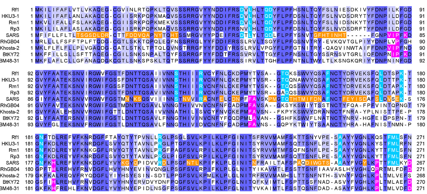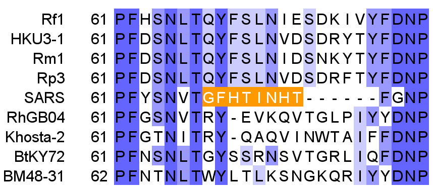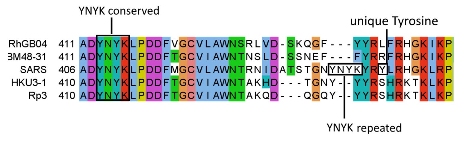 One small but important difference between SARS and most related bat viruses is that it has 3-5 residues inserted at the start of its RBM sequence, which are absent in both the Chinese and Afro-European bat covs. While the bat viruses have 2-3 Tyrosine (Y) residues, SARS has 4, and they are interleaved with other residues, rather than adjacent to each other. The extra residues extend the ACE2 binding interface so that it has more contacts with the receptor, forming a much stronger bond. Tyrosine is versatile in the types of bonds it can form.