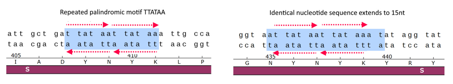 Interestingly the sequence YNYK that comprises the apparent insert is repeated a short distance upstream. The sequence is low complexity, comprised entirely of A/T bases and incorporates repeats which are also palindromic (read the same on both strands of DNA). There are 15 identical nucleotides between the 2 sites, making unlikely to be a random co-incidence.
