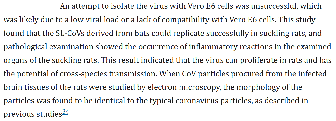 With the publication of ZC45/ZXC21 in 2018, the PLA gave us an inkling of how they may have obtained live virus. Tissue of an infected bat was ground up and injected directly into the brain of immune deficient suckling mice - a technique called intracerebral inoculation. At this stage the bat virus can’t bind ACE2, won’t infect VERO E6, or even bat cell cultures.