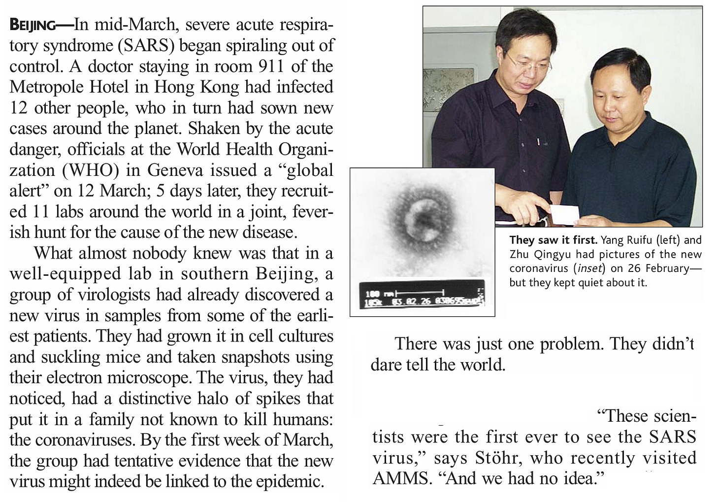 With the ability to culture a virus, microscopy can be used to determine the class of virus, allowing RNA to be amplified, isolated, sequenced. AMMS demonstrated their prowess to a visiting WHO virologist Klaus Stöhr in the aftermath of SARS. They admitted they had cultured and isolated SARS coronavirus from patient samples weeks before international groups succeeded, but - they kept it secret.