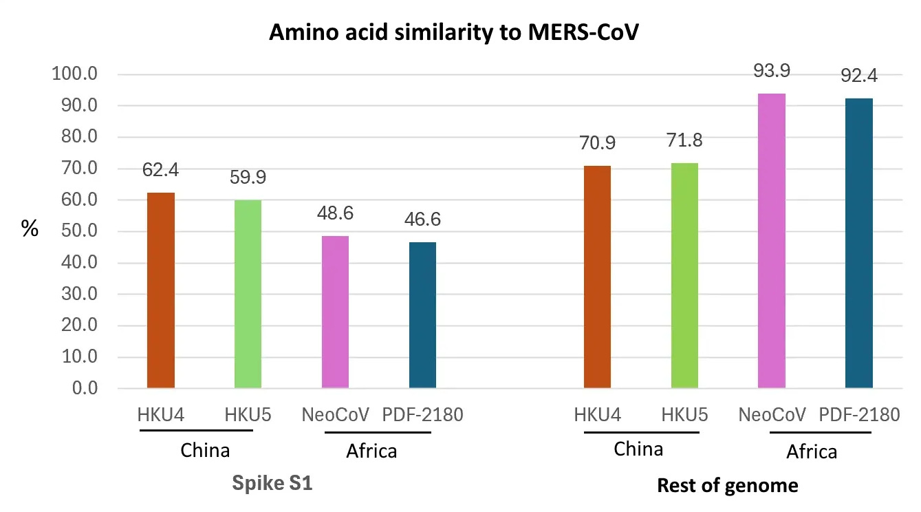 But the all-important S1 domain of MERS spike is quite divergent from NeoCov, being only 45% similar in amino acid sequence. Interestingly, the Chinese viruses HKU4 and HKU5 are more similar in S1 than NeoCov, each have around 60% amino acids the same as MERS. But that is still too distant to be regarded as a pre-cursor.