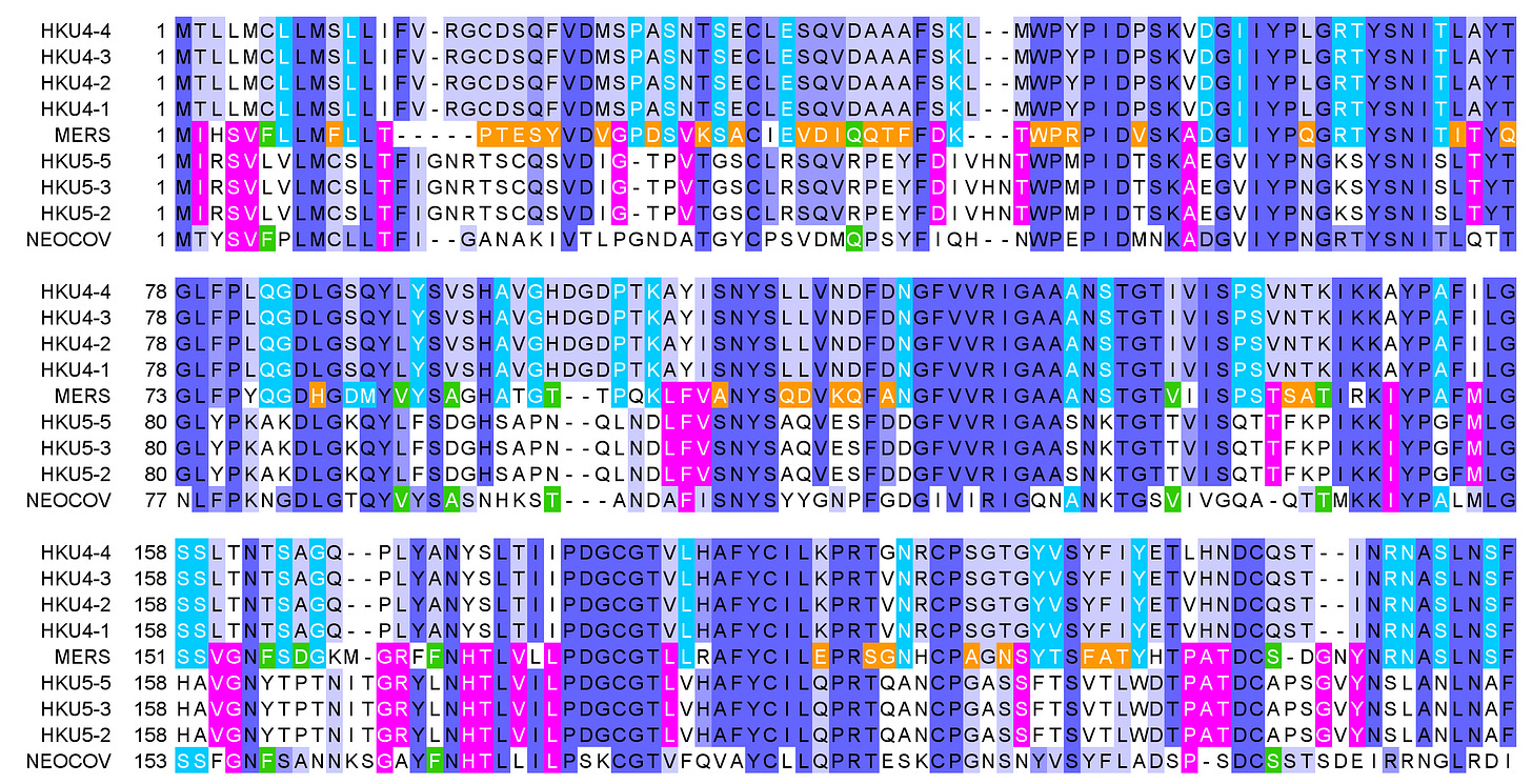 On an alignment of the spike it can be seen that MERS actually has much in common with both. It appears to agree with HKU4 (blue) in some regions and HKU5 (pink) in others. Occasionally it agrees with the more divergent NeoCoV (green), and sometimes it agrees with none of these (orange).