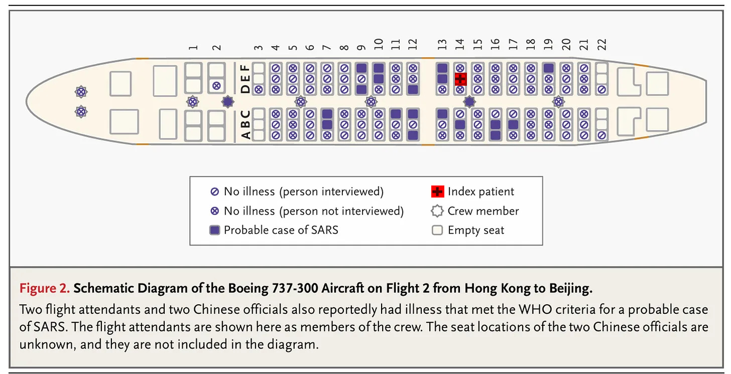SARS might be more notable for the number of flights that didn’t result in transmission, than those that did. The WHO retrospectively investigated 35 flights on which known SARS cases travelled and found that only 29 secondary infections resulted in total - further evidence if needed that SARS usually doesn’t transmit by aerosol. But of these 29 cases, 24 resulted from just one flight: China Airlines Flight 112 from Hong Kong to Beijing on March 15th, 2003.