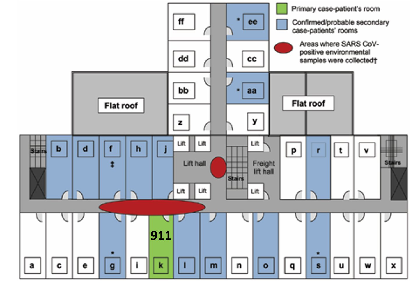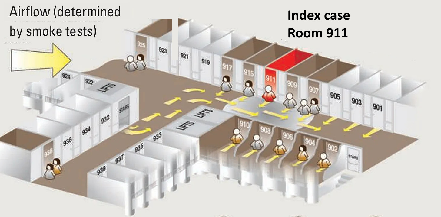 The WHO sent a team of Canadian environmental forensic specialists to investigate. They found traces of SARS genetic material in an air-conditioning inlet, and high concentrations on the carpet outside the door to Room 911 and adjacent rooms. They found no trace inside any of the rooms however, and ascertained using a smoke plume that there was a positive air pressure differential between the rooms and the hallway. Air flowed out of the rooms, not in. One clear conclusion was the spread had been via aerosol and had occurred in the hallway. But how could this have happened?