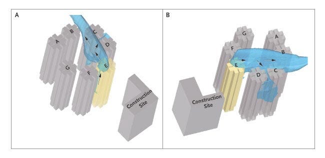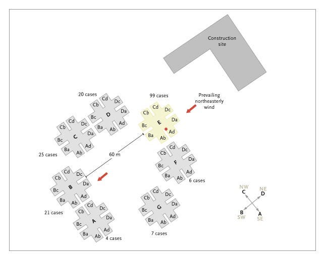 Adjacent to the estate was a high-rise construction site. One of the workers became a SARS case. Authorities discovered that the site had no toilets, workers were found to be just using the ground. There is a prevailing breeze towards the tower blocks. But it’s still impossible to believe hundreds of infections could result as far as 100m downwind.