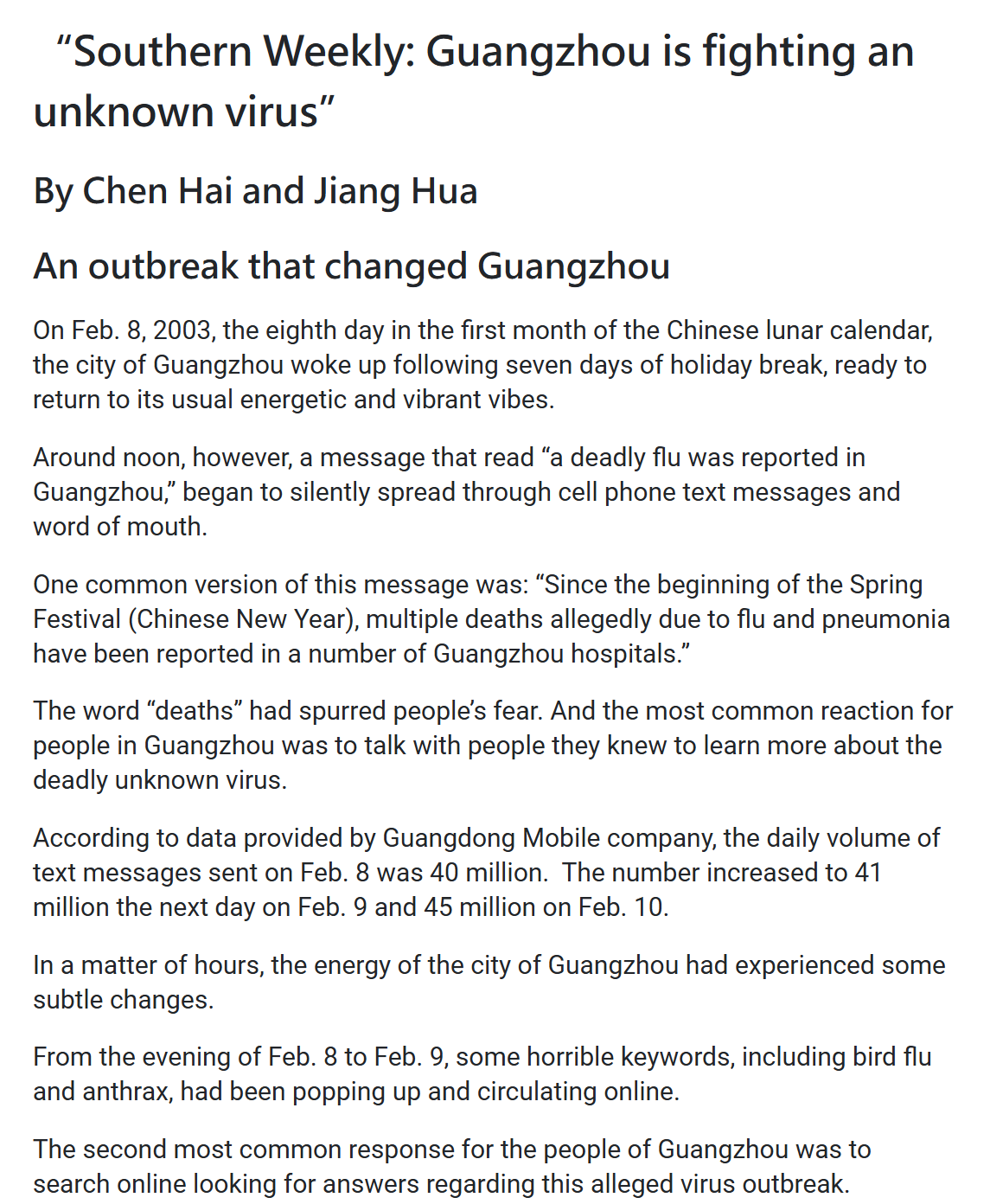 With no official or media comment, information instead spread by word-of-mouth, text message, email - so while everything might be regarded as rumour, some was verifiably factual (such as the large number of cases among healthcare workers). These “rumours” weren’t all being circulated by superstitious peasants in rural backwaters. Guangzhou is one of China’s four Tier 1 metropolises. Wealthy professionals and expats alike were withdrawing their children from the foreign schools, causing some to close. Southern Weekly, a Guangzhou paper with a reputation for fearless coverage in the face of government censorship published an article citing data from Guangzhou Mobile, that appears to be saying the text messages contained similar or identical content, with over 40 million messages a day being sent. This suggests an orchestrated campaign to fuel fear, rather than spontaneous mass hysteria. One standard message was “Since the Spring Festival, there have been many fatal cases of influenza pneumonia in Guangzhou, and several patients have died in several hospitals”. Whether or not intended, the effect was to deter people from attending hospitals (the first place Chinese people go for medical treatment). In April the editor-in-chief of Southern Weekly was removed and replaced with an official from Guangdong’s propaganda department. In May, Southern Weekly was accused of having published “state secrets” related to SARS. Days later authorities claimed to have implemented a tracking system to catch “rumor mongers” sending mass text messages about SARS.
