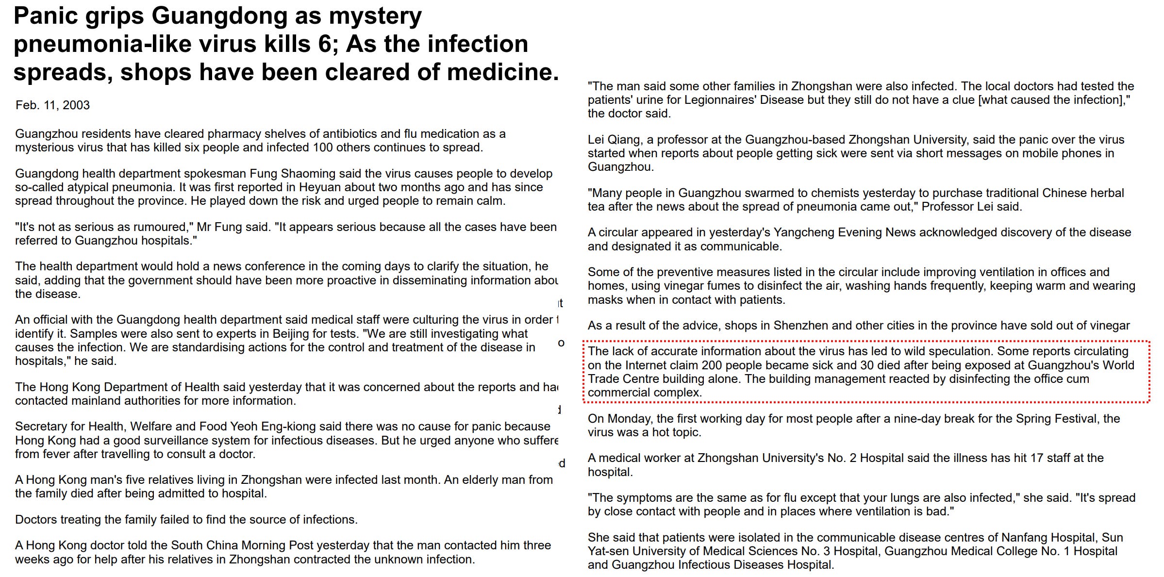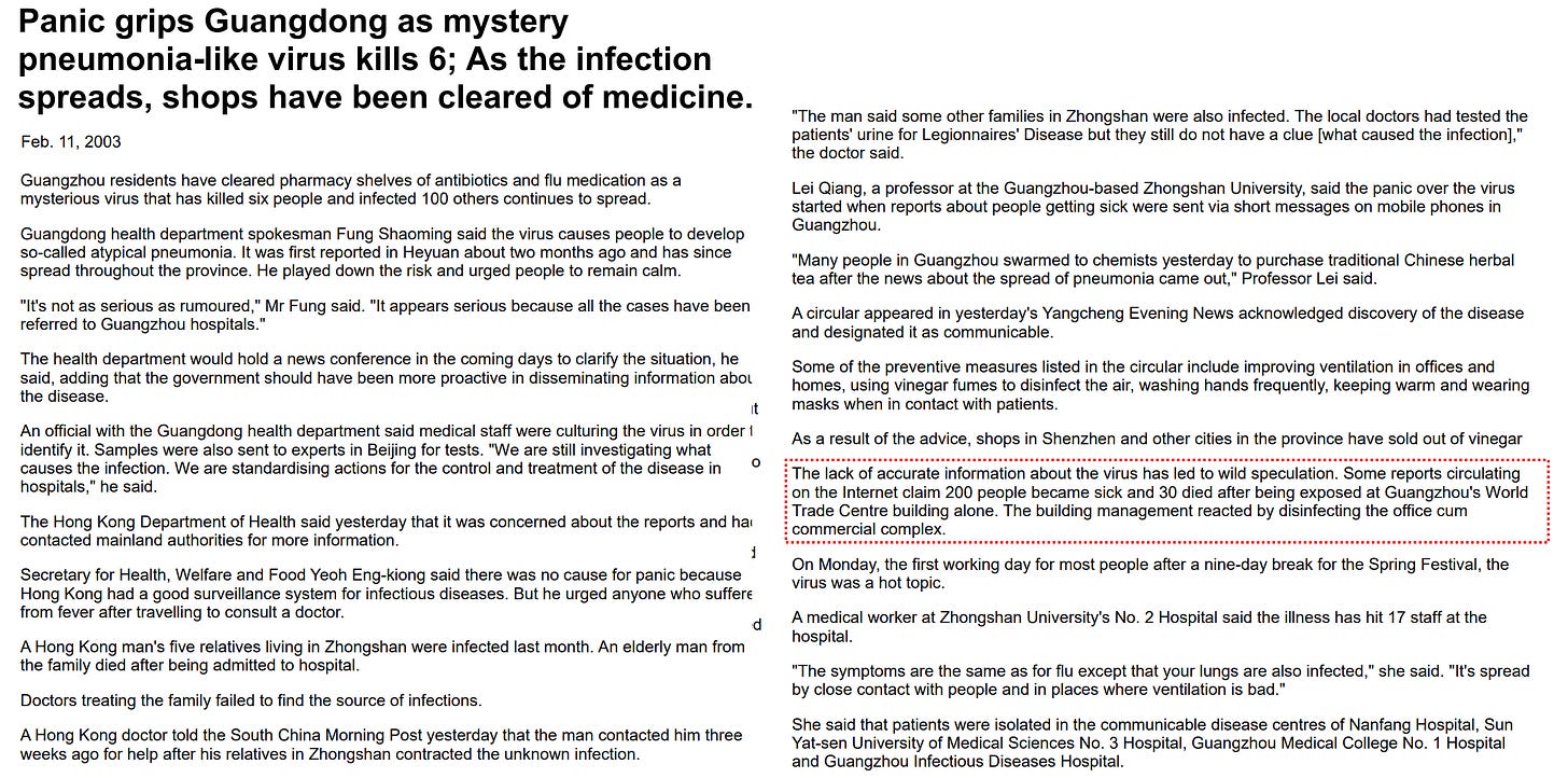 Two days later, SCMP carried a story “Panic grips Guangdong as mystery pneumonia-like virus kills 6”. This mystery atypical pneumonia would later become known as SARS. Buried near the end, of the story with the suggestion that it might be “wild speculation” an incident is mentioned in which 200 people became sick and 30 died after being exposed at Guangzhou’s World Trade Center.