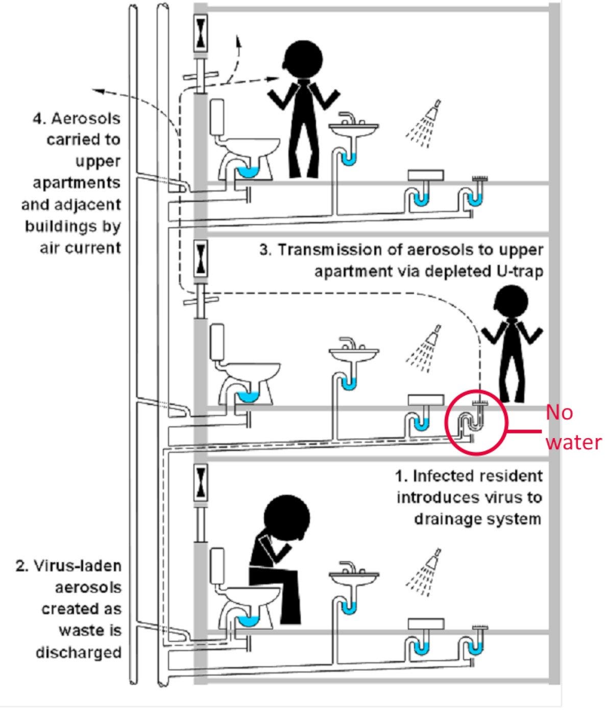 The Amoy Gardens housing estate comprises 19 high-rise towers each of 30-40 floors. The official story (which changed several times during the course of investigations) is that a 26 year-old Shenzhen man with kidney disease traveled regularly for dialysis at Hong Kong’s Prince of Wales Hospital, where he may have acquired the atypical pneumonia. He sometimes stayed overnight at his brother’s apartment in an Amoy Gardens tower. On the 21st March while visiting, he had diarrhea. When he flushed the toilet, virus-laden feces became aerosolized. Due to a faulty plumbing system these aerosols were carried into neighboring apartments. Ventilation systems further transmitted the plume.
