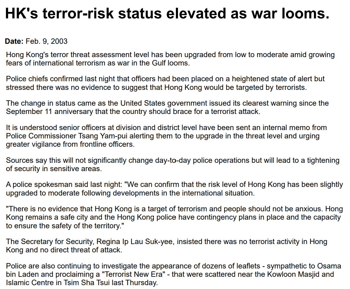 With the invasion of Iraq imminent, terror threat levels were being raised around the world. On Feb 9th, 2003, Hong Kong’s South China Morning Post (SCMP) published a piece “HK’s terror-risk elevated as war looms” noting the official assessment level had been raised from Low to Moderate. While politicians continued to reassure that the threat was low, police investigated leaflets distributed near Kowloon mosque, that were sympathetic to Bin Laden and proclaimed a “Terrorist New Era”.