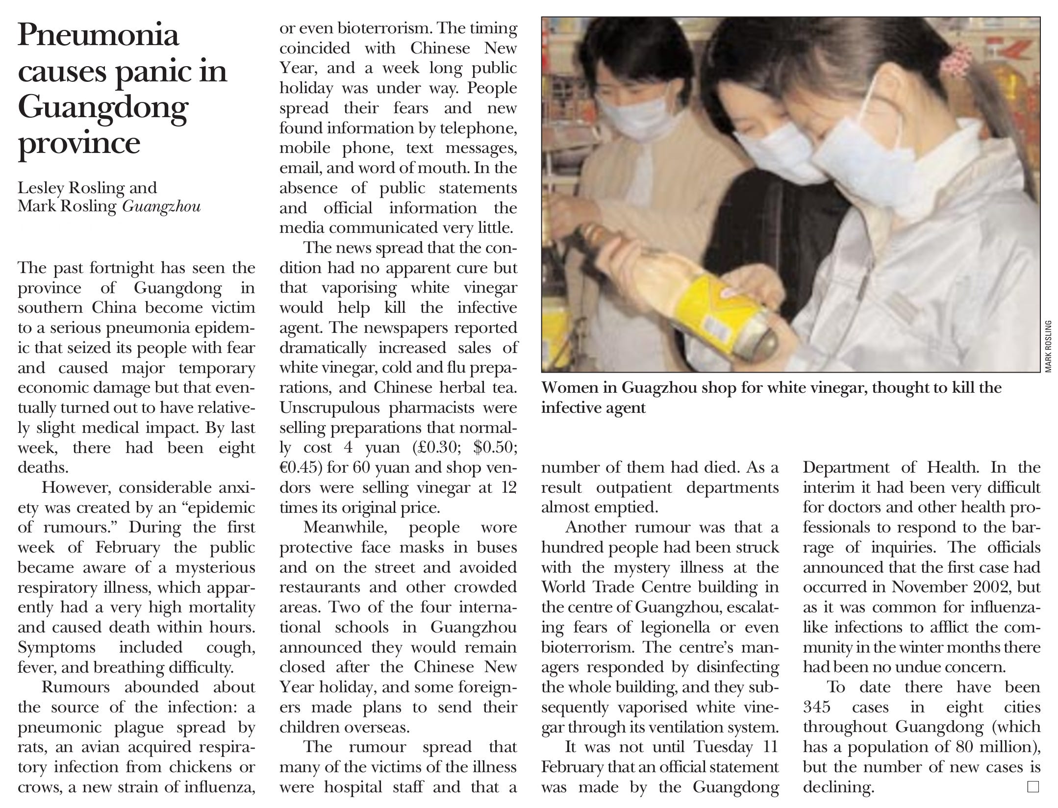 “Another rumour was that a hundred people had been struck with the mystery illness at the World Trade Centre building in the center of Guangzhou, escalating fears of legionella or even bioterrorism. The center’s managers responded by disinfecting the whole building, and they subsequently vaporised white vinegar through its ventilation system”