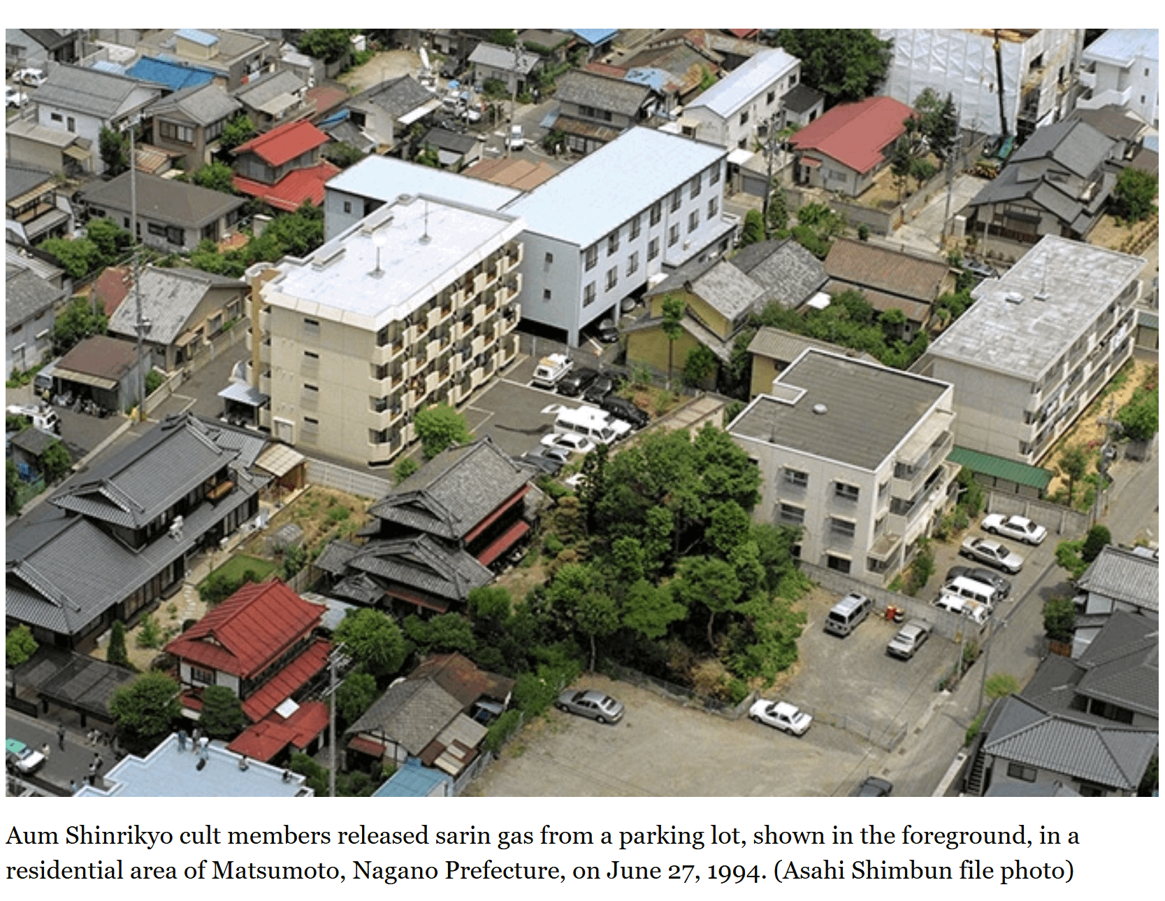 Aum Shinrikyo’s first fatal attack occurred in 1994. A converted refrigerator truck was parked in a stand of trees contained an improvised aerosolizing device consisting of a heater, pump and fan controlled by computer. By night, a cloud of sarin, an organic nerve agent was released, wafting on a gentle breeze towards a cluster of residential buildings. The inhabitants included three judges sitting on a case in which the cult was the defendant. The gas entered through open windows and air-conditioning inlets. Before long eight people were dead, with hundreds more needing hospitalization. This attack may have provided the inspiration for an unrecognized bioterrorist attack on Hong Kong during the SARS epidemic (subject of a future post).