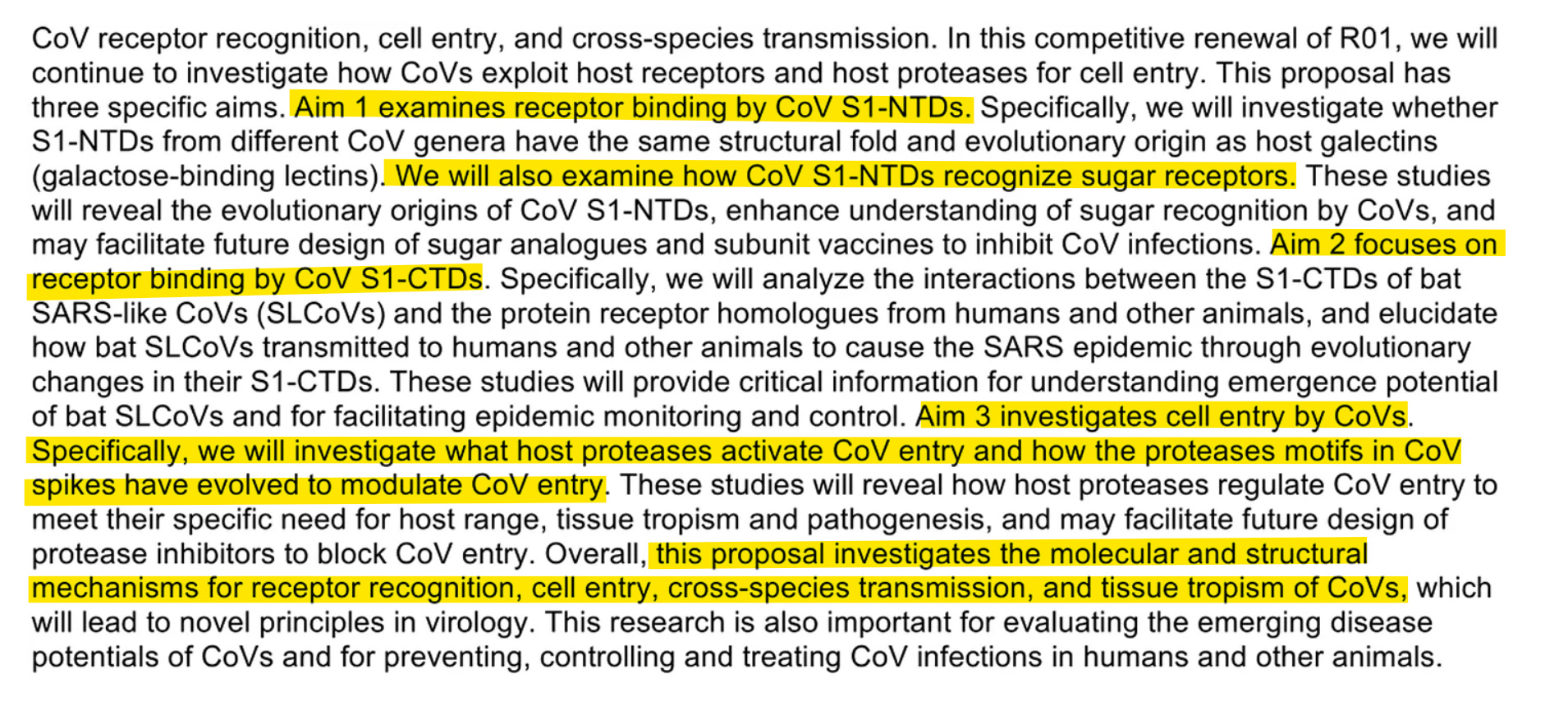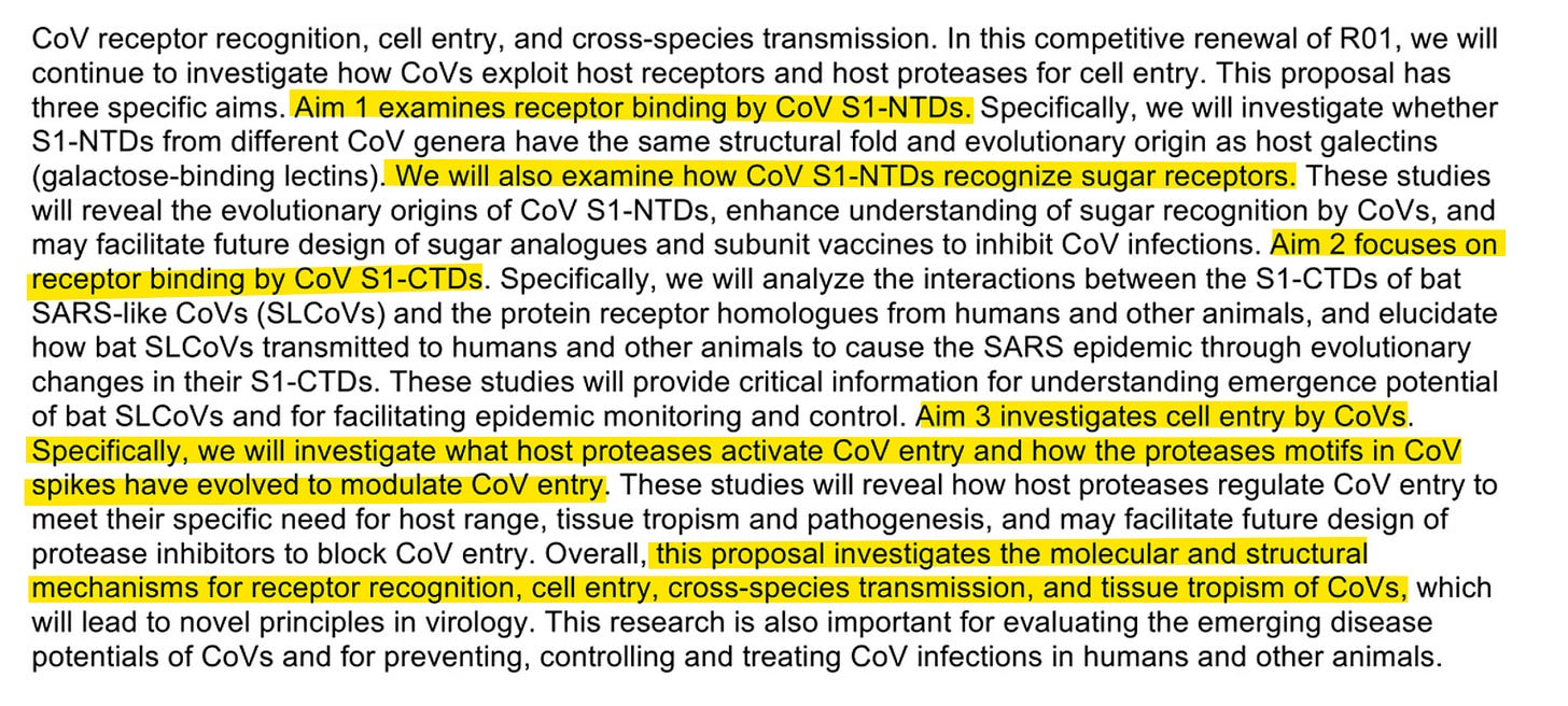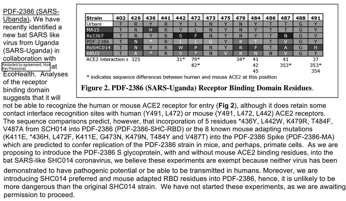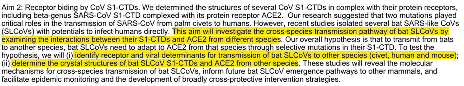 FOI documents acquired by US Right to Know show Fang Li’s proposed work would have determined the crystal structure of bat coronaviruses in complex with ACE2 of various species. This work might be useful in informing the design of a chimeric RBD. It’s unclear if this work was ever done, no results have been published.
