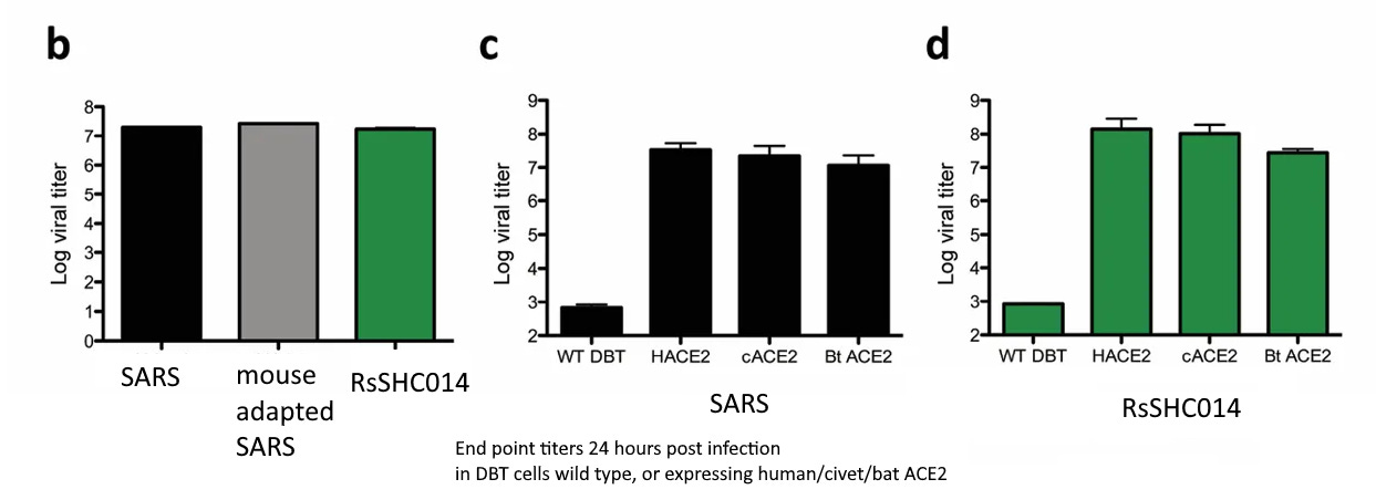 Another virus that was known and is divergent from these is PDF-2386. This was discovered by the PREDICT consortium in Uganda and is similar to other African viruses (e.g. BtKY72). PDF-2386 and RsSHC014 were the subject of proposed experiments by Ralph Baric and Fang Li in 2017-18, which were stalled due to the Gain of Function moratorium in place at the time. It isn’t clear if they ever went ahead.