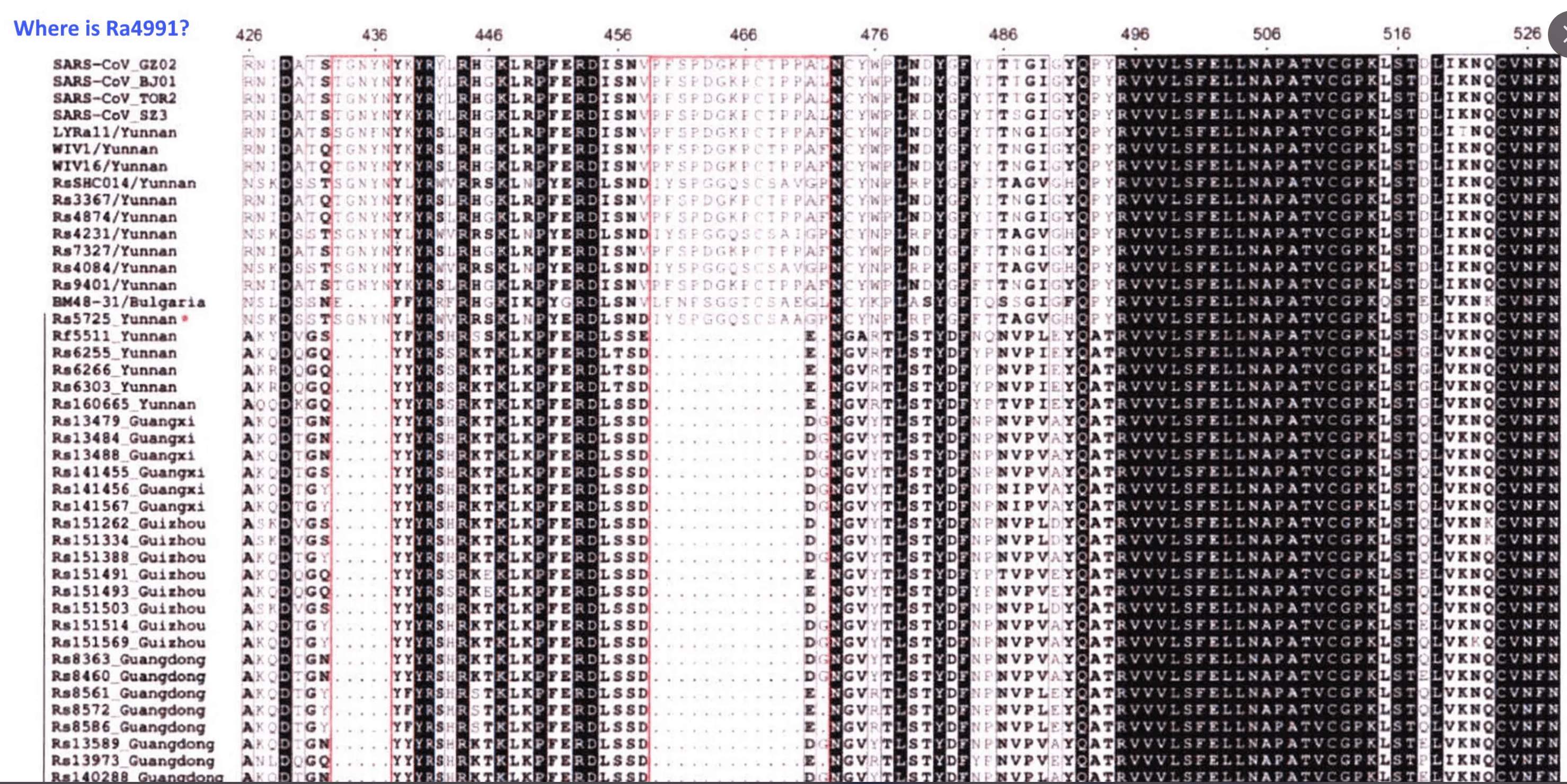 Jie Cui, and his doctoral student Yu Ping were responsible for sequencing RaTG13 - (although curiously their names aren’t listed as authors on the eventual paper). In July 2018, they uploaded partial sequence data to GenBank for RaTG13, and many other viruses, but they omitted the all-important spike gene. In Yu Ping’s thesis there is an alignment of the RBDs of these new viruses, but RaTG13 was again omitted.