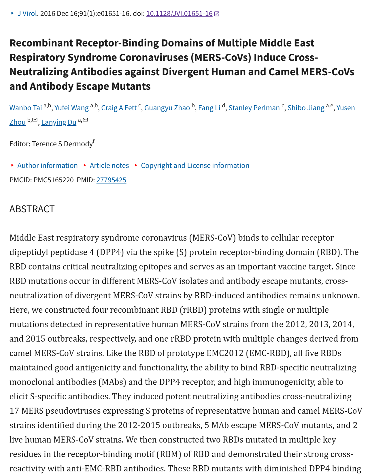 Chimeric RBMs were of interest to scientists researching broad spectrum coronavirus vaccines, like this team featuring AMMS officers Wanbo Tai and the mysteriously deceased Yusen Zhou. They took mutations from various MERS strains, including camel variants and combined them into more divergent RBDs. Antibodies against wild-type MERS worked well, but these new RBDs have only a handful of mutations from that strain.