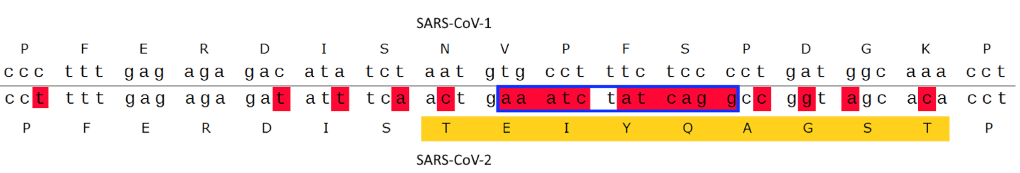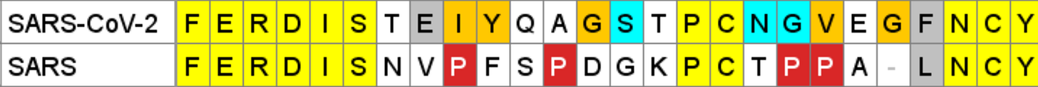 The SARS-1 sequence has a remarkable 5 Proline residues in a region of 12. Proline adds structural rigidity that can reduce binding affinity. In SARS-CoV-2, only one Proline is conserved, while two Glycines are gained (Glycine is small and flexible). This creates a much more flexible structure in this loop, allowing closer contacts, stronger bonds to form with the ACE2 receptor.