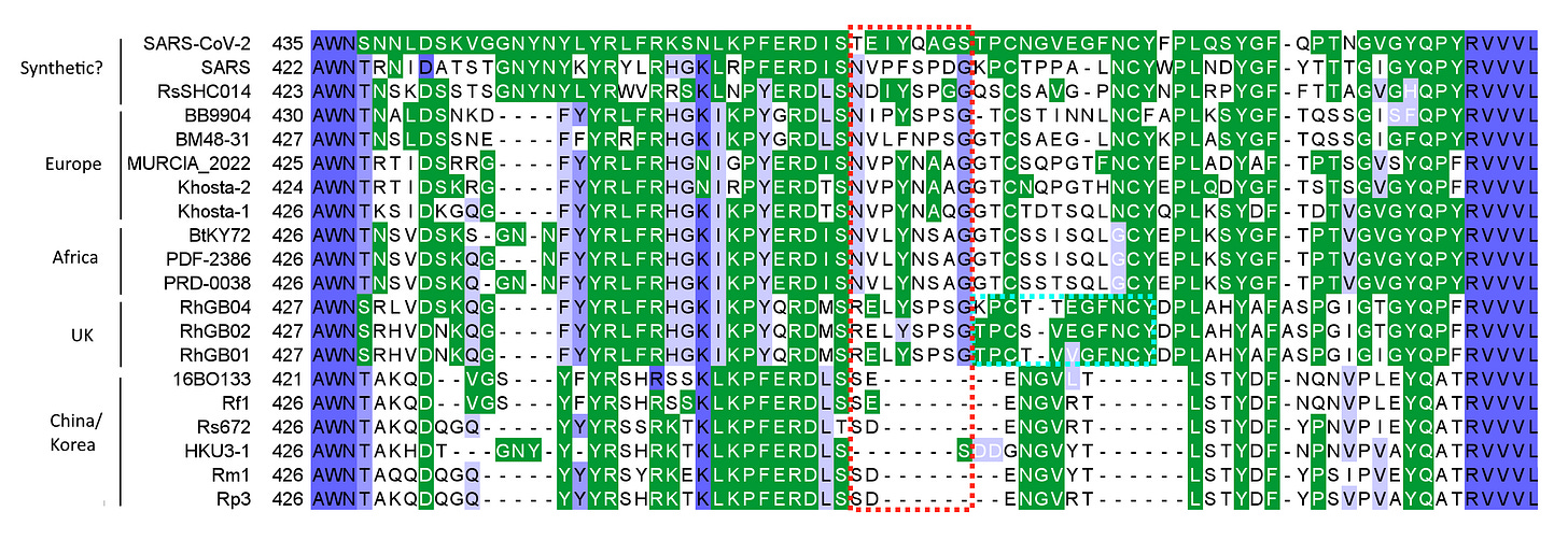 However not all the sequences in this alignment were published before the SARS-CoV-2 outbreak. The region in the cyan box shows particularly close homology between SARS-CoV-2 and bat viruses from the UK (e.g. RhGB02). But no UK viruses were sampled or published before the outbreak. At least, none were known to have been discovered. This suggests viruses might have been sampled but not disclosed. Based on other documentary evidence this is almost certainly the case in South-East Asia and China, but perhaps also further afield.