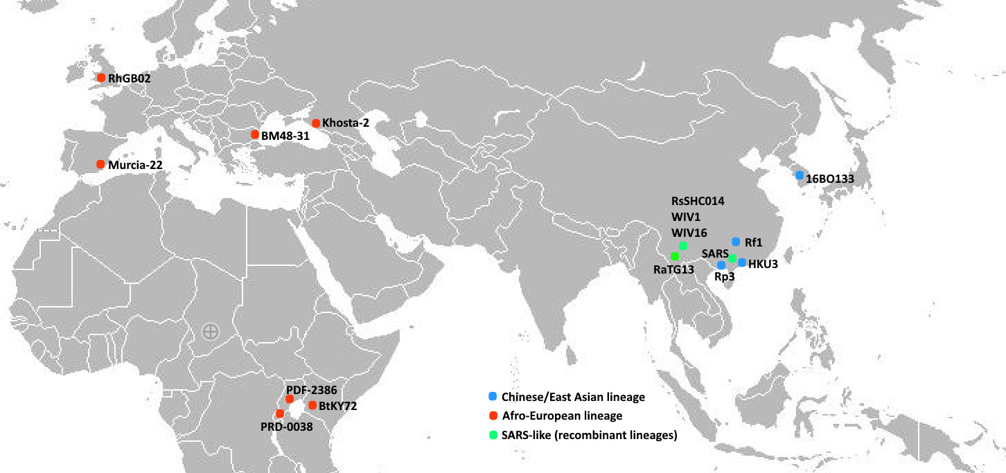 In 2008 a team led by Christian Drosten discovered a bat virus, BM48-31, which had (at the time) the closest RBD to SARS. This is surprising because BM48-31 was sampled from bats in Bulgaria, 8000km from Guangdong where the SARS outbreak started.