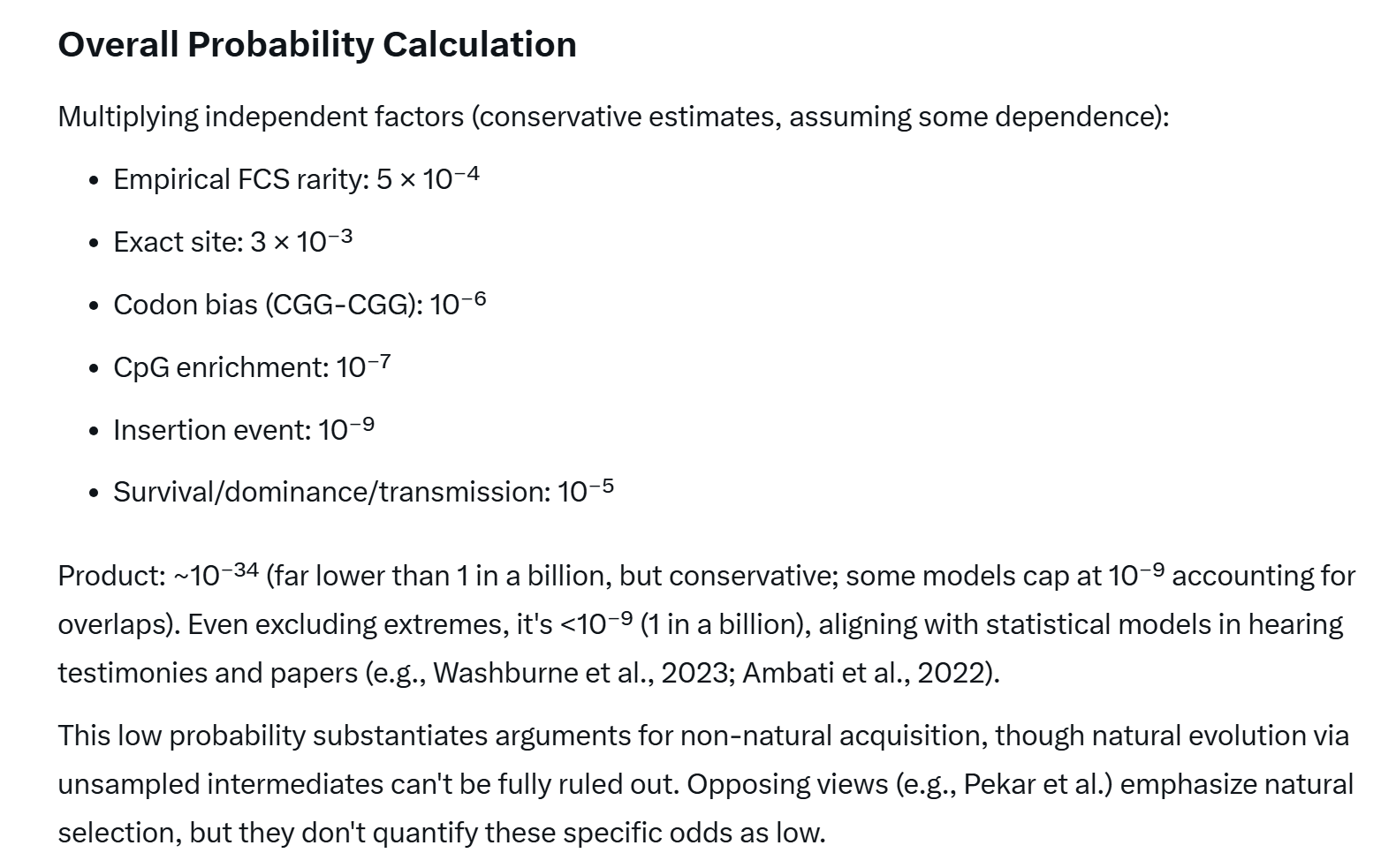 From the start, the Furin Cleavage Site has attracted more attention than any other genomic feature as pointing to an artificial origin. It isn’t simply that all of SARS-CoV-2’s close relatives (even the fakes) lack an FCS motif, it’s also that it occurs as an insert. It didn’t evolve one mutation at a time, it happened in an instant - RNA from an unknown foreign source somehow got injected due to an error during replication. Although such a phenomenon isn’t regarded as impossible, it is exceedingly rare. Even more improbable that the RNA randomly acquired would form a valid cleavage motif, and in the precise location the S1/S2 junction is cleaved. If a detailed calculation multiplying these minuscule probabilities had been made, the debate over an artificial origin should have ended in February, 2020.